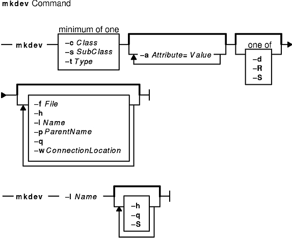 mkdev { -c Class -s Subclass -t Type } [ -l Name ] [ -a Attribute=Value ] ... [ -d | -S | -R ] [ -f File ] [ -h ] [ -p ParentName ] [ -q ] [ -w ConnectionLocation ]