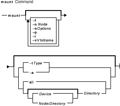 mount [ -f ] [ -n Node ] [ -o Options ] [ -p ] [ -r ] [ -v VfsName ] [ -t Type | [ Device | Node:Directory ] Directory | all | -a ] [-V [generic_options] special_mount_points ]