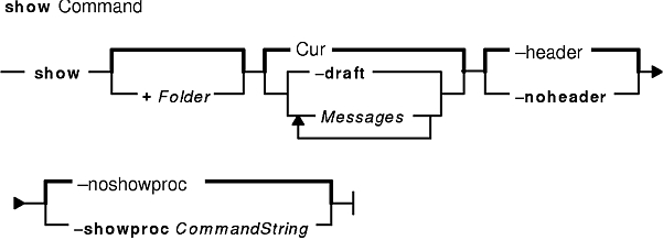 show [ +Folder ] [ -draft | Messages ] [ -header | -noheader ] [ -showproc CommandString | -noshowproc ]