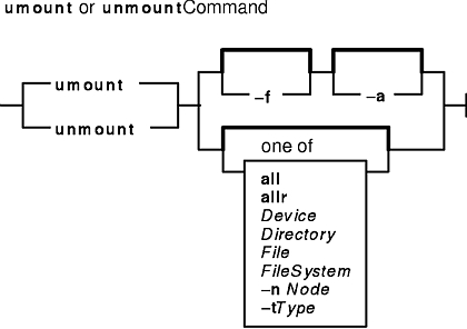 { unmount | umount } [ -f ] [ -a ] | [ all | allr | Device | Directory | File | FileSystem | -n Node | -t Type ]