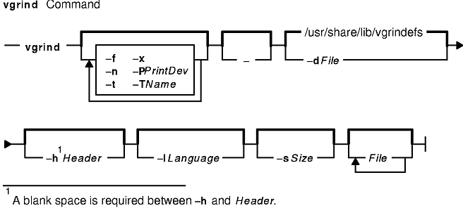 vgrind [ -f ] [ -n ] [ -t ] [ -x ] [ -PPrintdev ] [ -TName ] [ - ] [ -dFile ] [ -h Header ] [ -lLanguage ] [ -sSize ] [ File ... ]