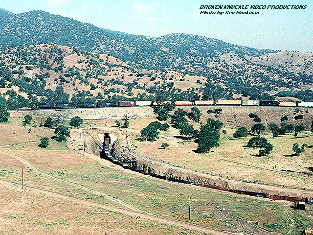Pacific freight train crossing over itself at Tehachapi Loop in Southern California. From BROKEN KNUCKLE VIDEO PRODUCTIONS. Mid-Air Nice Quality! |