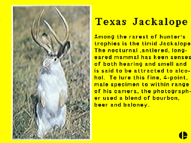 | texasj.gif | 88631(bytes) | A GIF of a RARE photo of a TEXAS JACKALOPE!